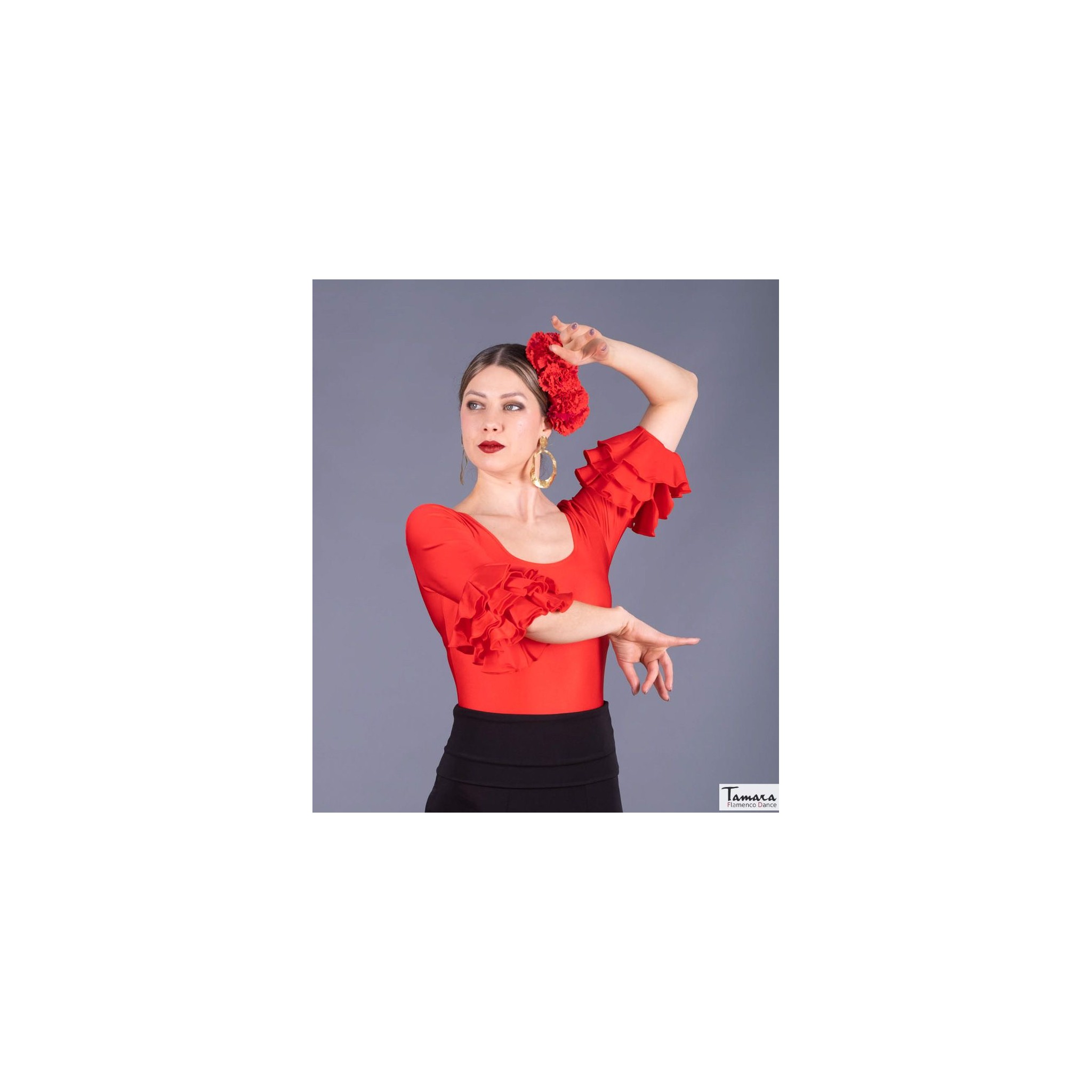 The Jaleo body is one of our clients' favorites. It is made in a high quality lycra fabric and has a classic body cut with half sleeves decorated with flounces at the end. It is very easy to combine with any style of flamenco costume, whether it's rehearsal or to wear on stage. It is available in a wide variety of colours and sizes so you can choose the one that best suits your flamenco costume. It is an ideal option to wear with skirts with more risky fabrics or prints such as lace. If you are looking for a versatile and good quality body, the Jaleo body is without a doubt the most successful choice. The material is authentic Lycra, which ensures a long durability of the garment in both colors and elasticity.