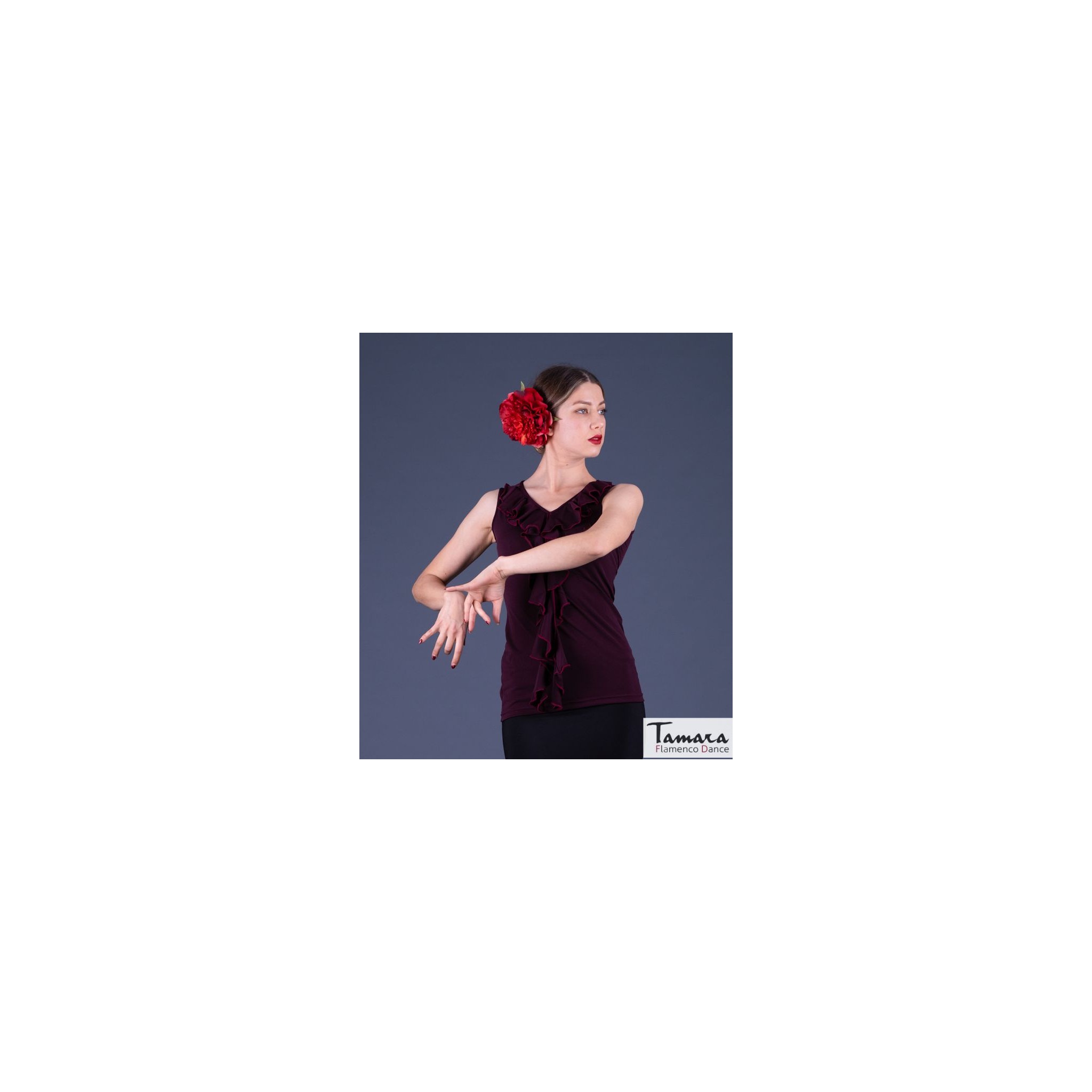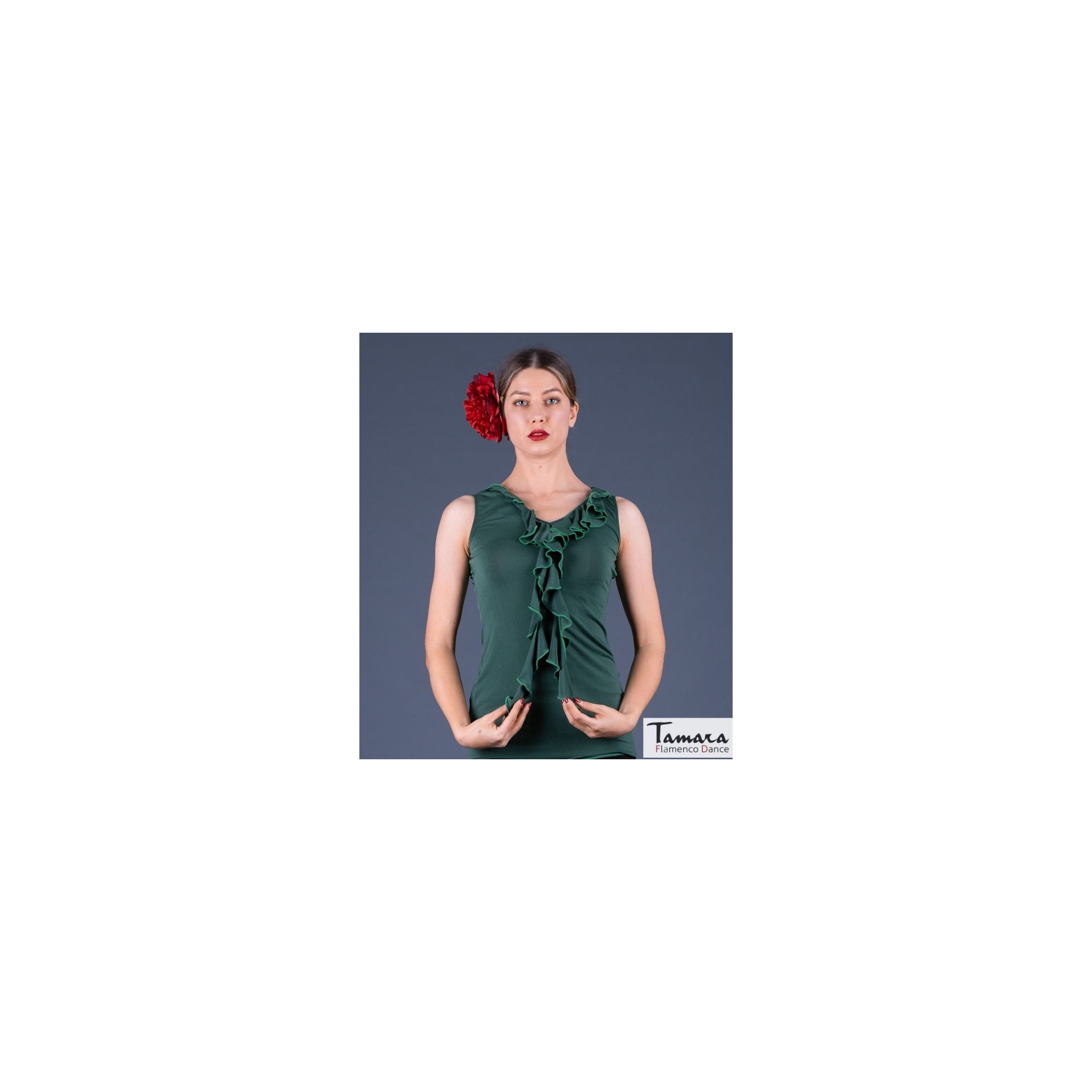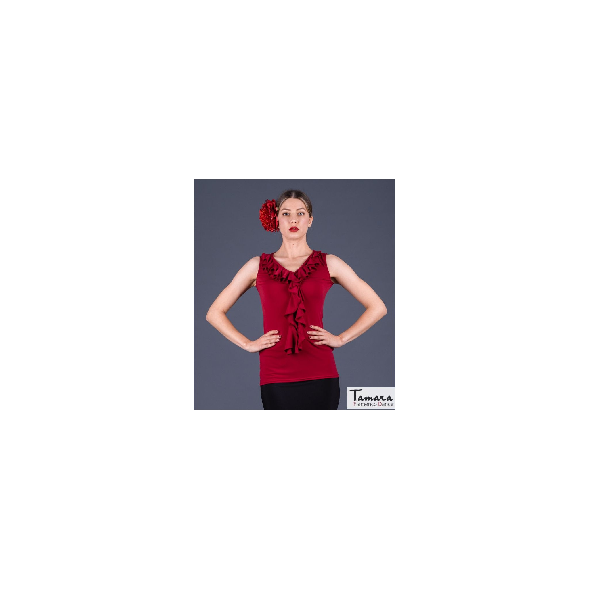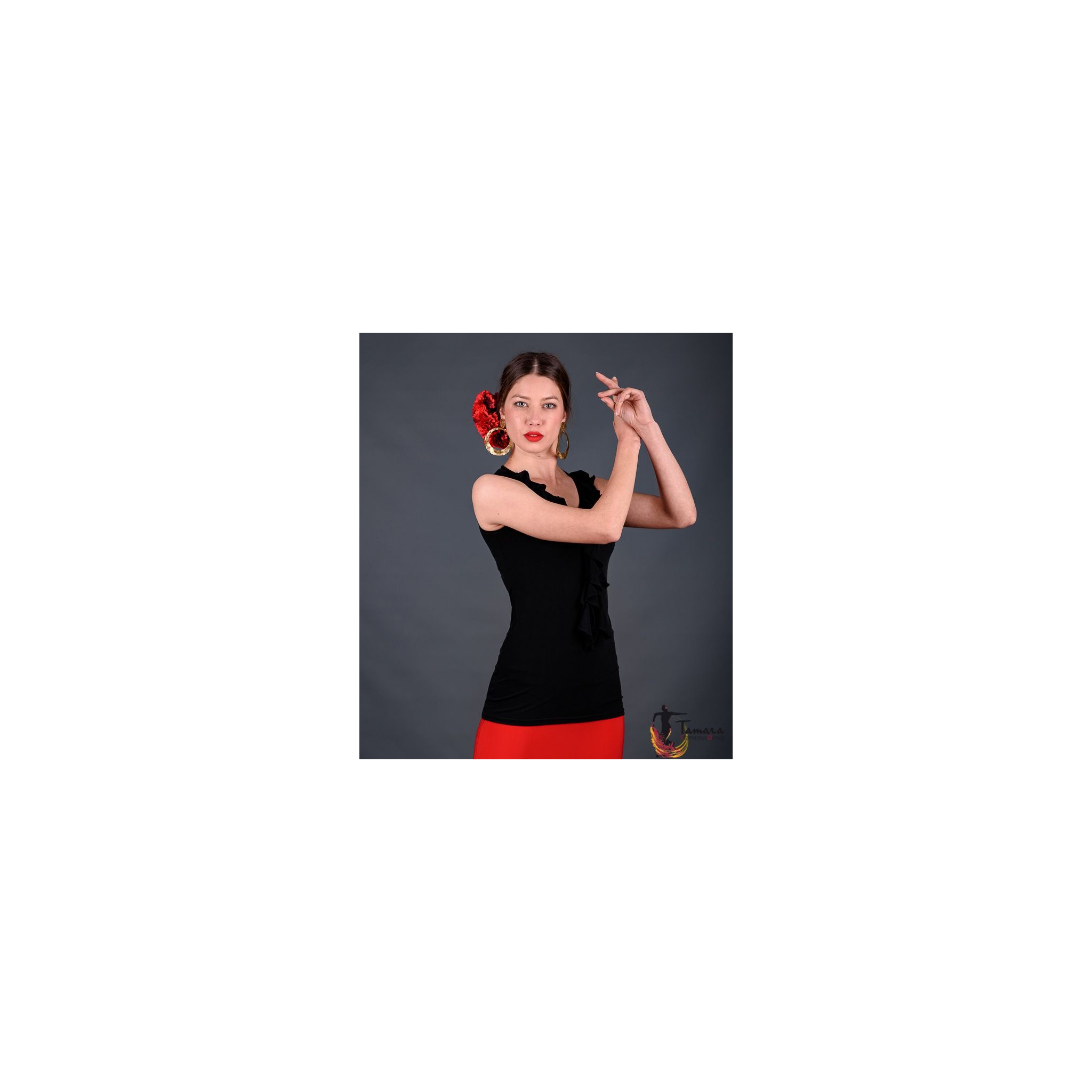 La camiseta Tango es uno de los modelos de tops más versátiles para bailar flamenco. Es una camiseta de tirantas anchas con adornos de volantes que rodean todo el escote que es de pico. Está disponible en varios colores y combina muy bien con cualquier falda, en especial con el modelo Almería en el mismo tejido de viscosa. Es muy fácil llevarla al bailar flamenco, ya que su tejido es muy confortable y fresco. Además favorece tanto, que incluso es una buena opción para llevarla con ropa de calle cualquier día o para ferias y romerías. Si está buscando ampliar su vestuario flamenco con una camiseta versátil, original y que sienta de maravilla, sin duda este modelo es lo que está buscando.