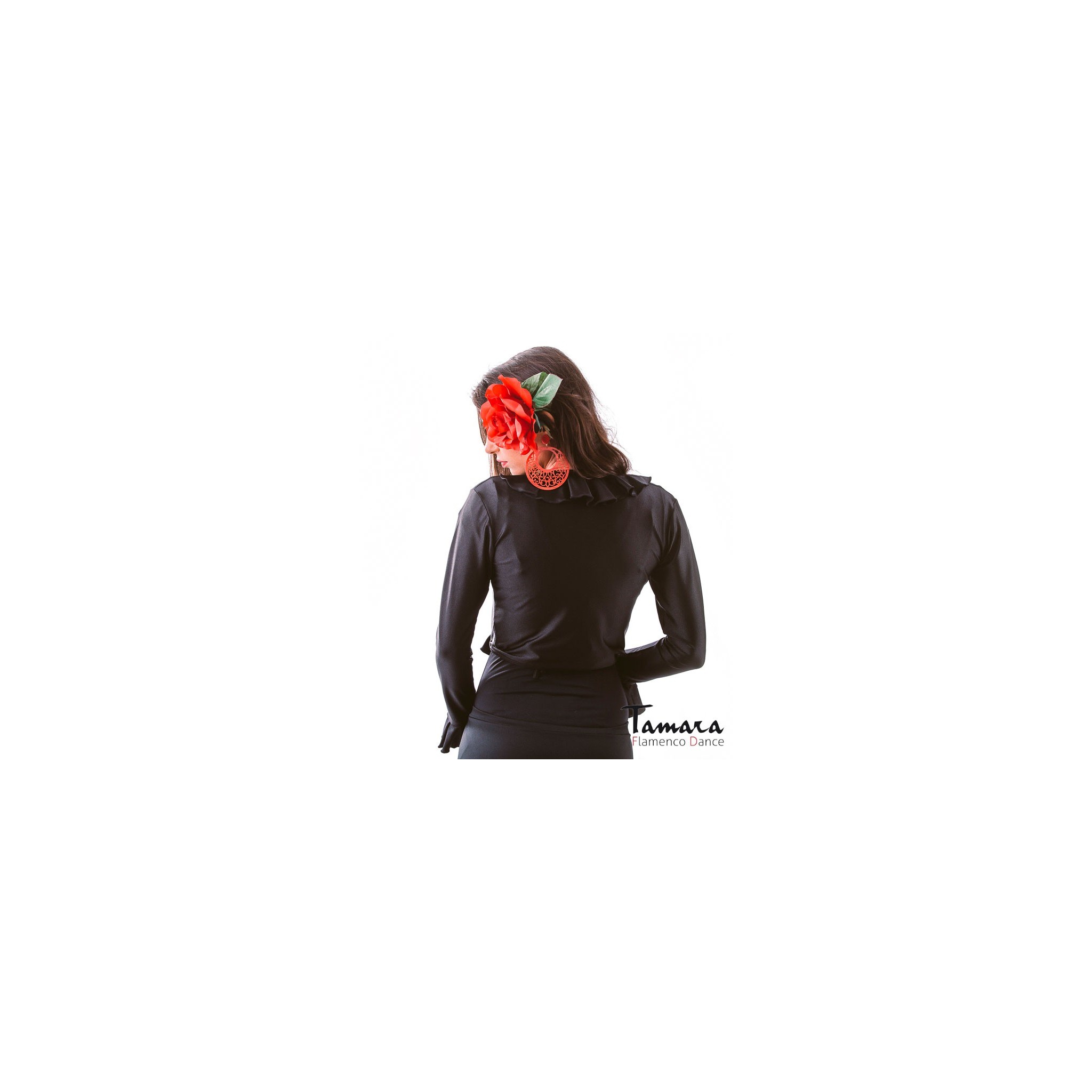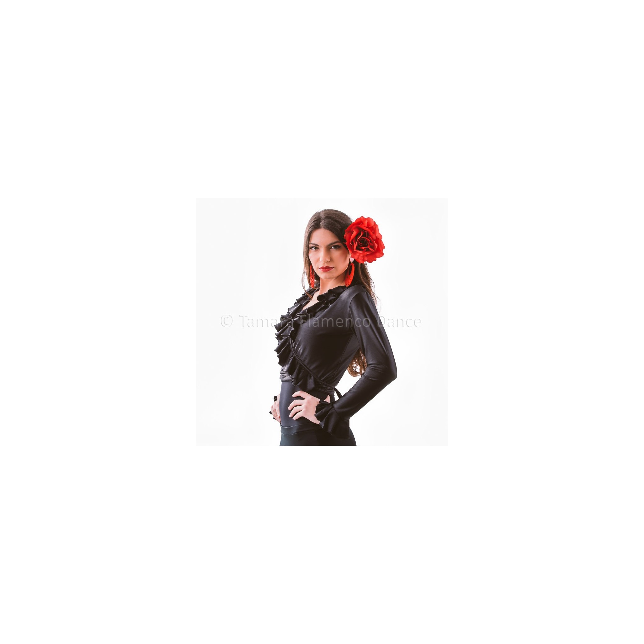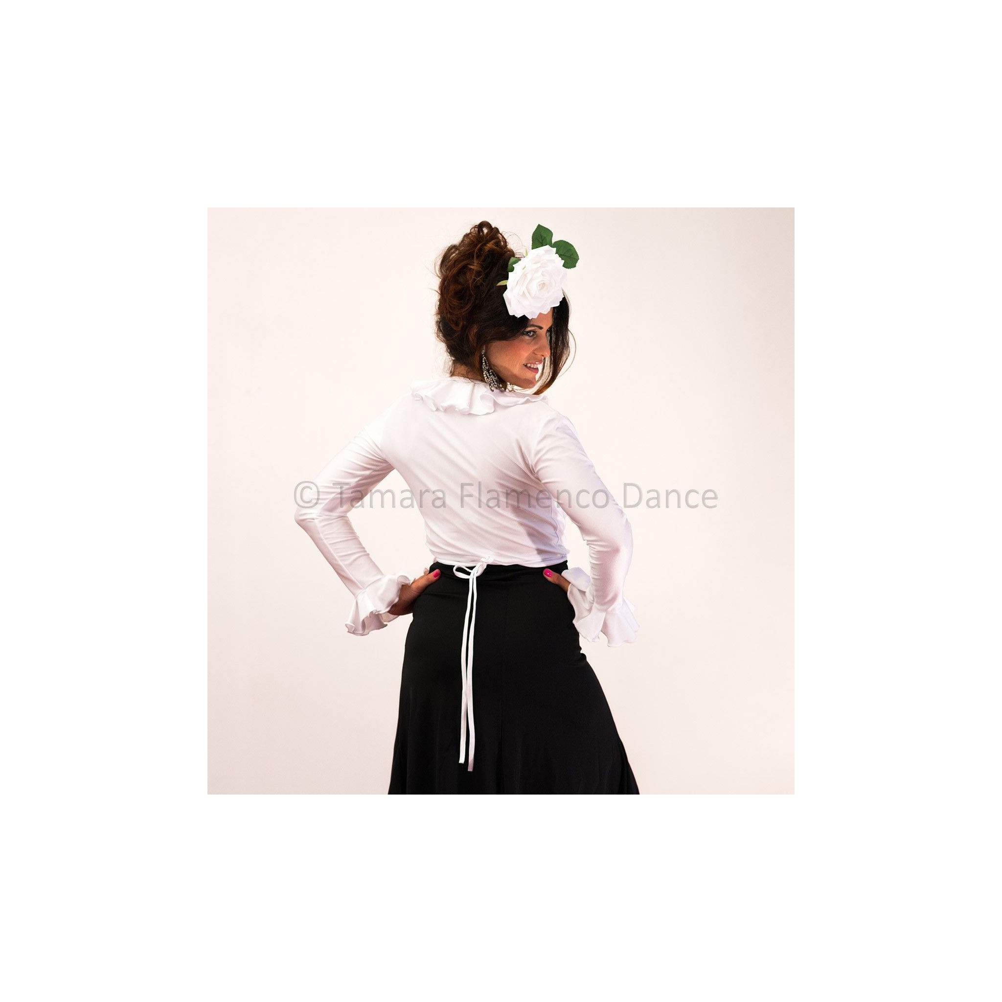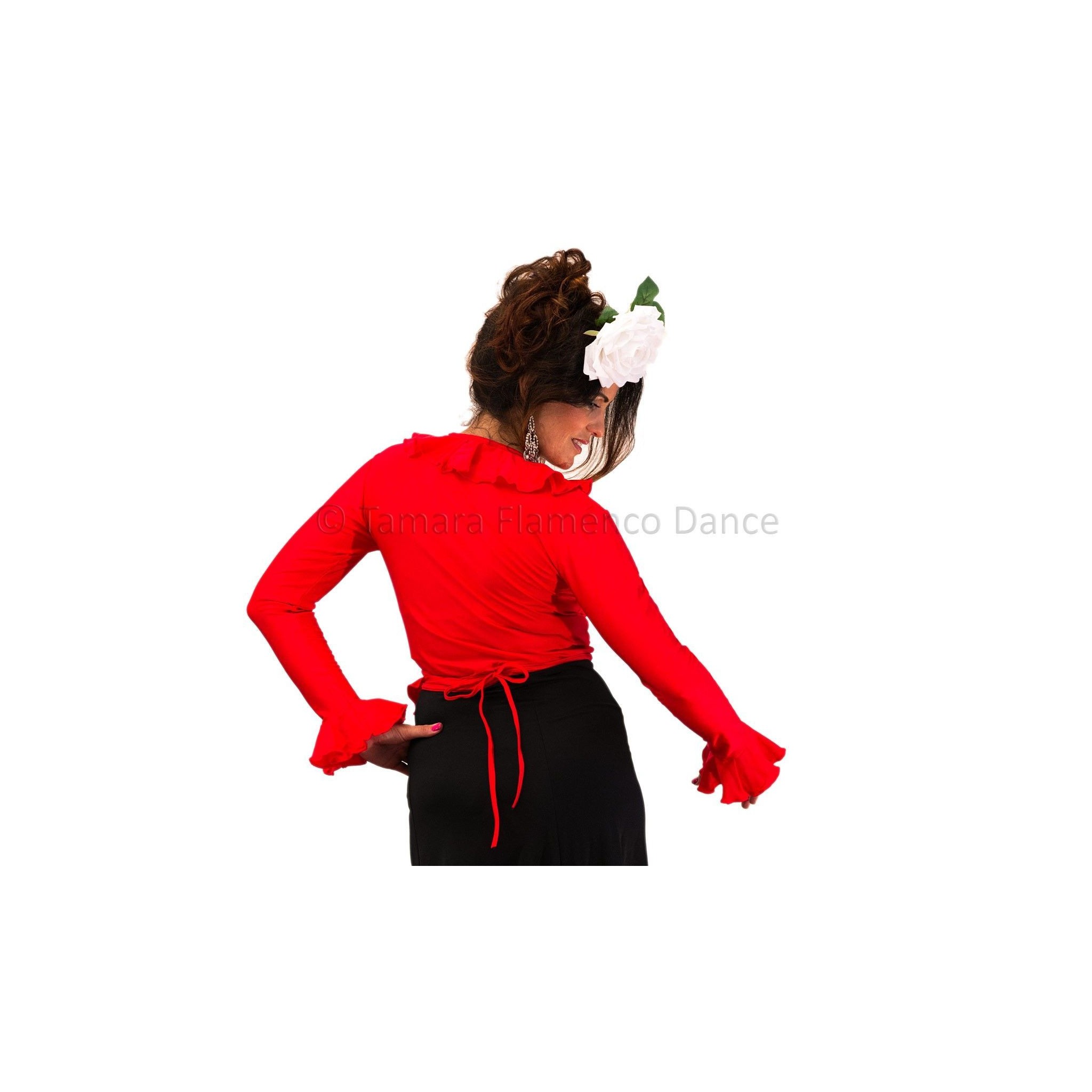 La chupita Poderío es un modelo que aportara el arte que su vestuario necesita. Es una chupita de mangas largas que acaban en pequeños volantes y uno más grande que rodea todo el escote de la chupita y que queda muy original cuando se anuda detrás. Puede llevarla encima de algún body o sola con vestidos o con faldas que queden por encima de la cintura. El tejido de lycra es muy confortable de llevar y es 100% lycra autentica. Este modelo se puede combinar con cualquier estilo y tejido, y contamos con un amplio catálogo de colores para escoger el que mejor vaya con sus faldas y vestidos para bailar flamenco. La chupita es ideal para el baile flamenco ya que le aporta un toque diferente al vestuario clásico, pero es una prenda fácil de llevar cuando se baila.