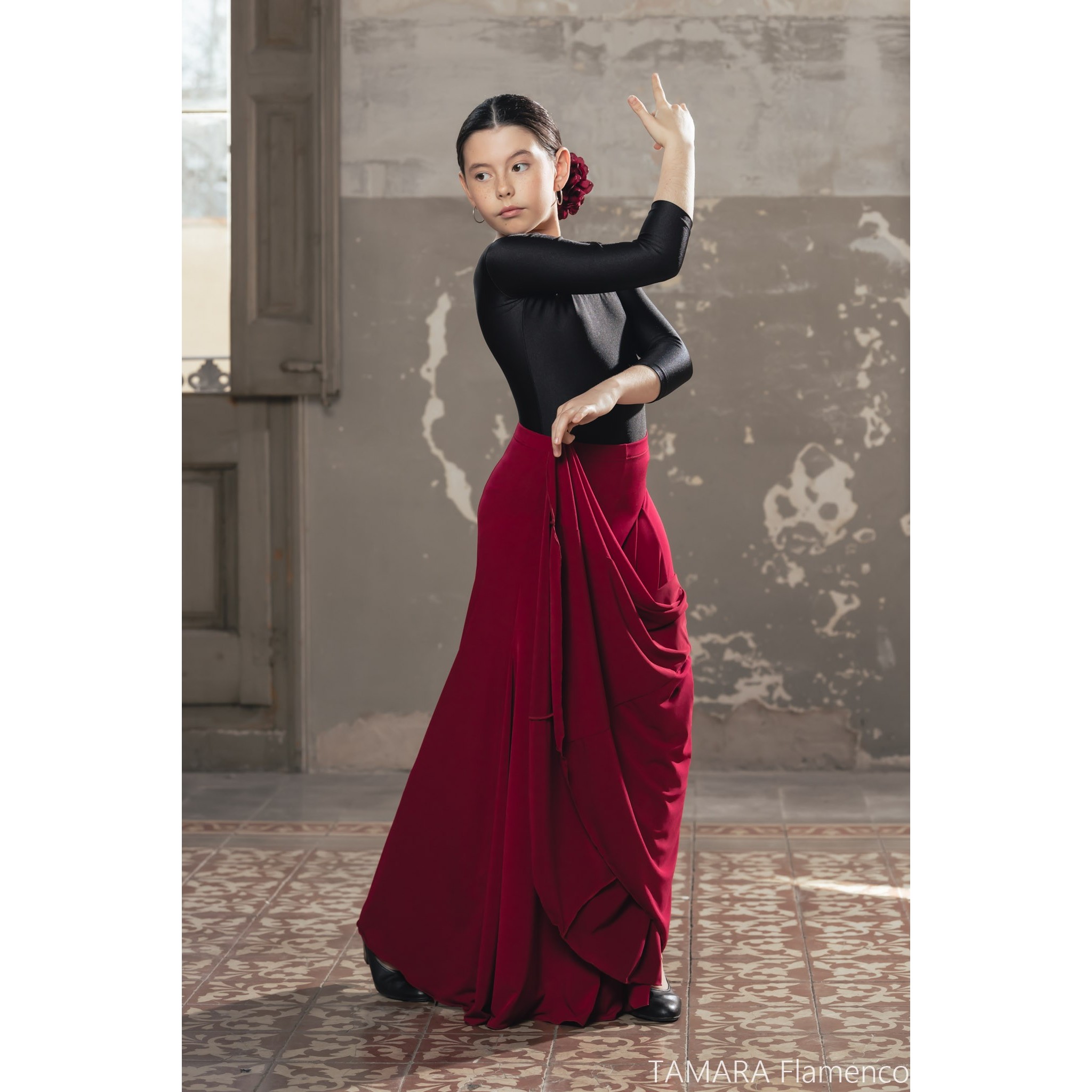 Material: Mirella está confeccionada en un tejido de punto elástico especial para faldas de baile que la hacen muy confortable y ligera. Nuestro punto elástico se ajusta perfectamente a cualquier tipo y forma de cuerpo de bailaora de flamenco y es altamente resistente a las carrerillas provocadas por el roce de los clavos en los zapatos de baile flamenco. Este tejido tiene una bonita caida, no se arruga y no crea electricidad estática.