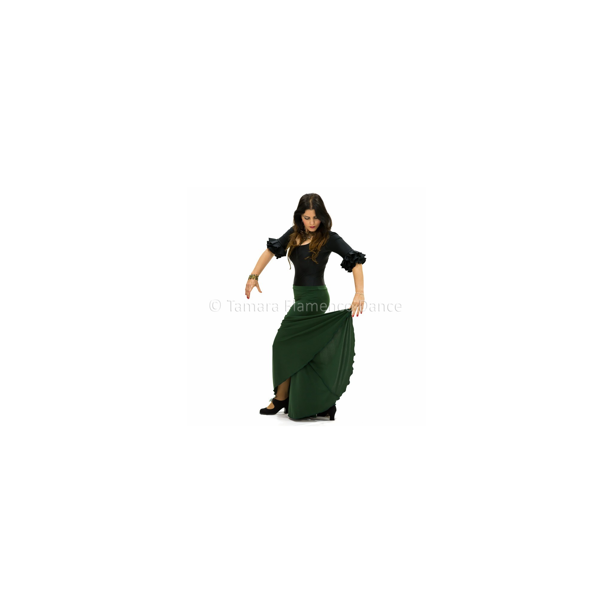 La falda de flamenco Granada en viscosa es uno de los modelos que más favorecen y estilizan la figura de la bailaora flamenca. La parte de la cadera es entallada hasta media pierna para acabar con un corte sirena. Esto hace que estilice y realce la silueta del cuerpo femenino pero también la falda en vuelo facilita mayor movimiento en el baile y hace que el resultado sea espectacular. Es una opción perfecta para principiantes que quieran buscar un diseño más original y distinto pero no quieran renunciar a la comodidad de una falda ligera. Además el tejido viscosa se adapta muy bien pero sin ser demasiado apretado, por lo que podrá disfrutar de esta bonita falda flamenca en cualquier ocasión que lo necesite.