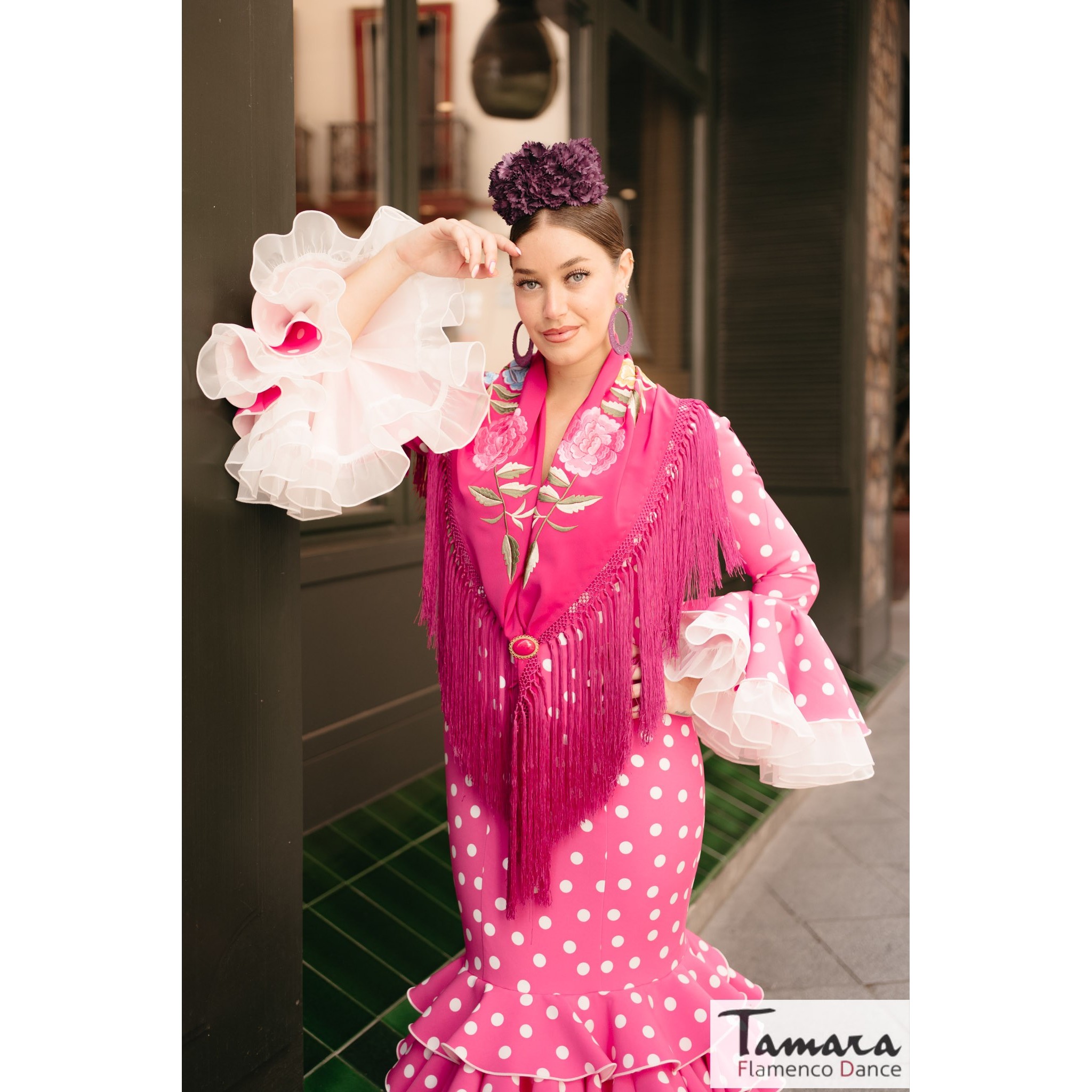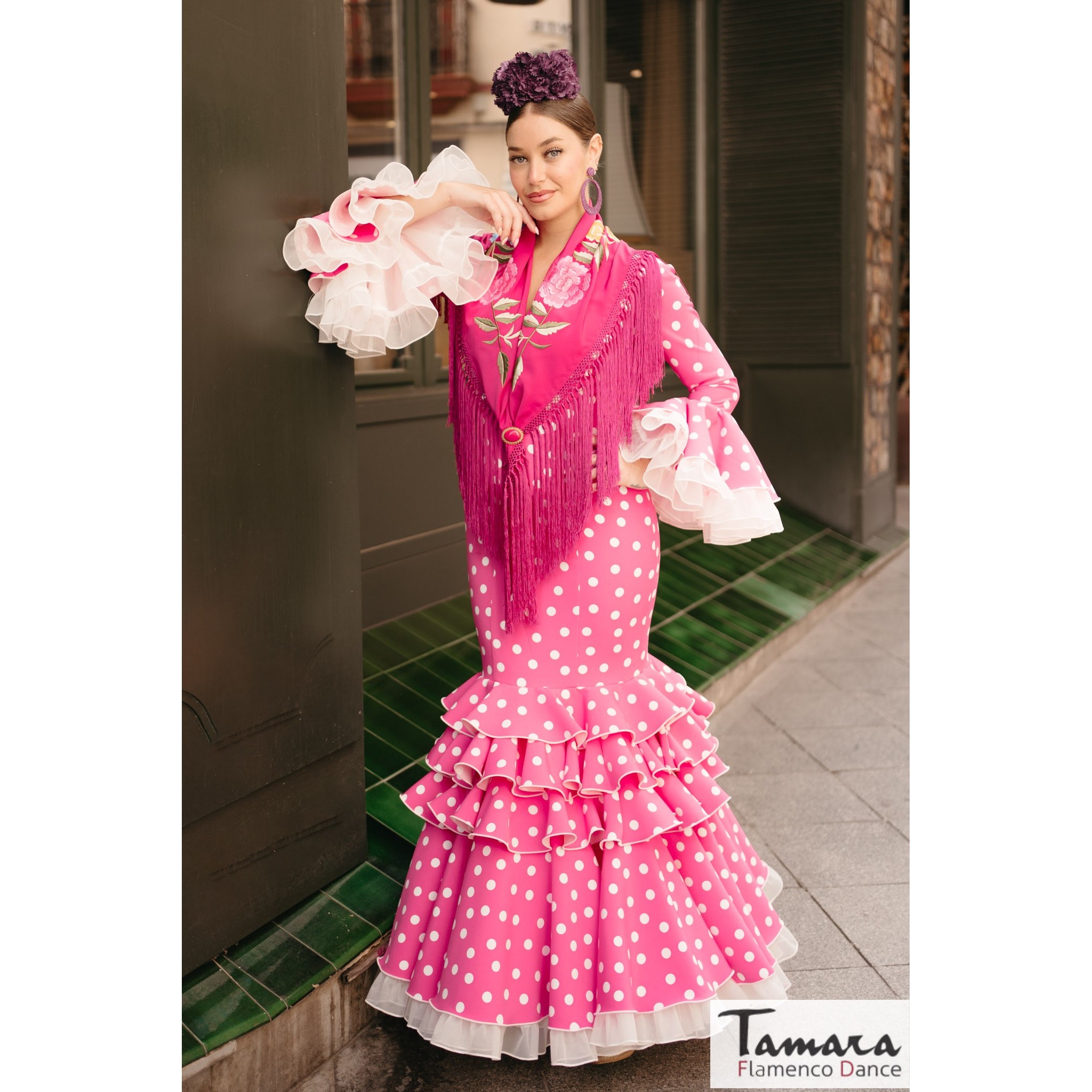 Traje de flamenca Clavel fuxia lunar blanco