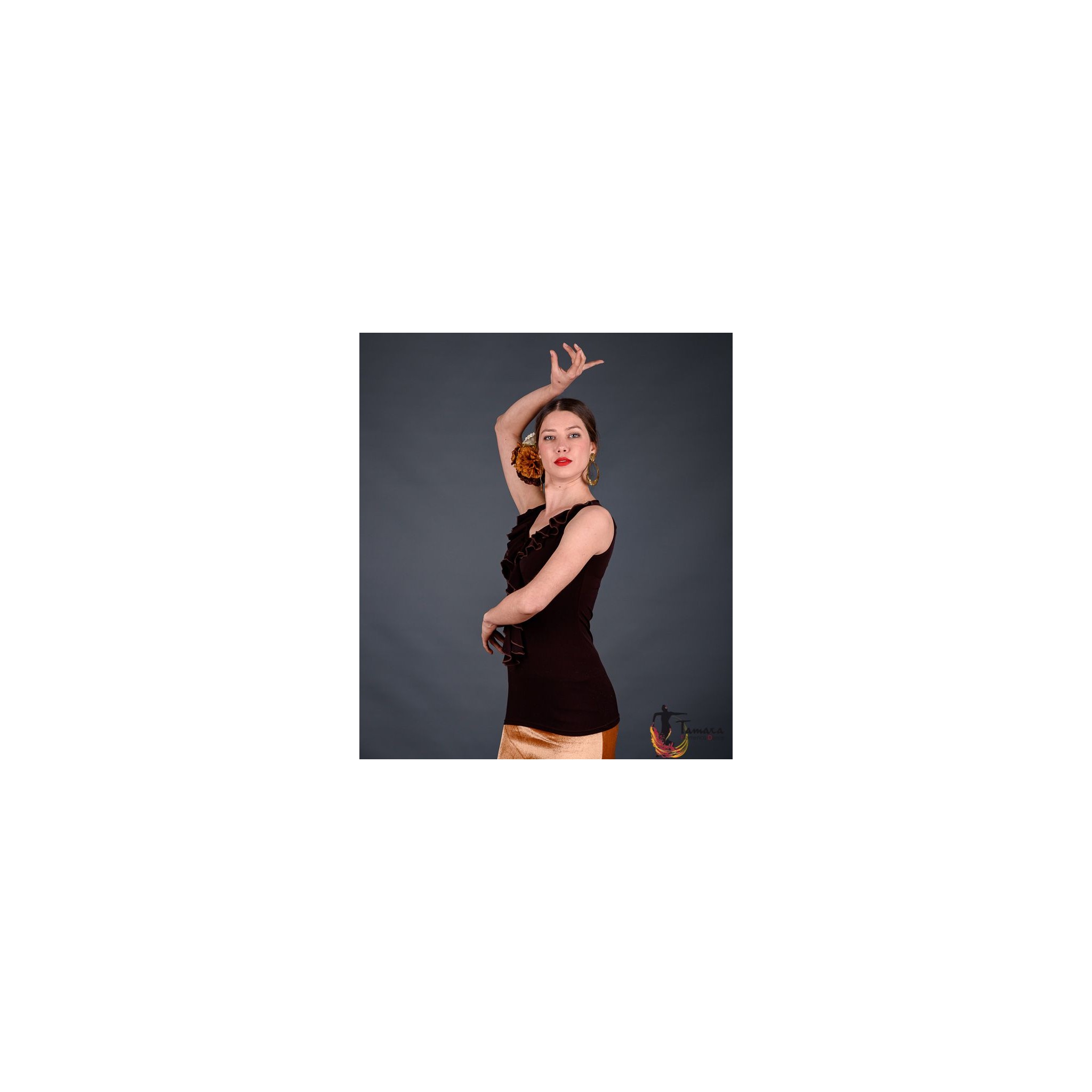 Le t-shirt Tango est l'un des modèles de tops les plus polyvalents pour danser le flamenco. C'est un t-shirt avec des bretelles larges avec des ornements de volants qui entourent tout le décolleté en forme de V. Il est disponible en plusieurs couleurs et combine très bien avec tout type de jupe, spécialement avec le modèle Almeria avec le même tissu en viscose. Il est très facile à porter pour danser le flamenco, vu que son tissu est très confortable et frais. En plus, il met si bien en valeur, que c'est même une bonne option pour le porter avec des habits de rue n'importe quel jour ou pour les ferias et fêtes. Si vous cherchez à agrandir votre vestiaire flamenco avec un t-shirt polyvalent, original et qui met parfaitement en valeur, ce modèle est sans doute celui dont vous avez besoin.