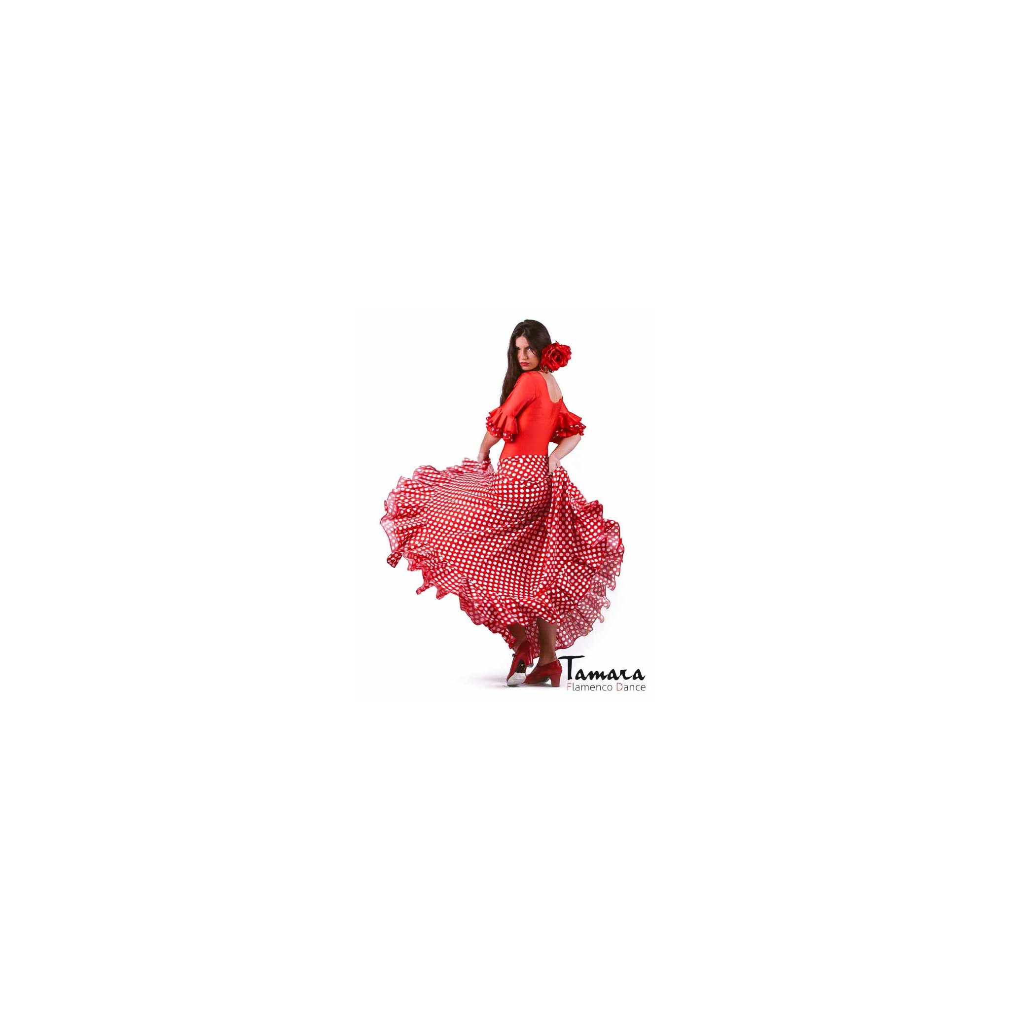 Description du modèle: La jupe Sevillana à pois est une jupe flamenca avec une coupe classique avec une centure élastique très adaptable. Ce modèle à une coupe taille haute, la ?capa? entière et les volants à la fin de la jupe.