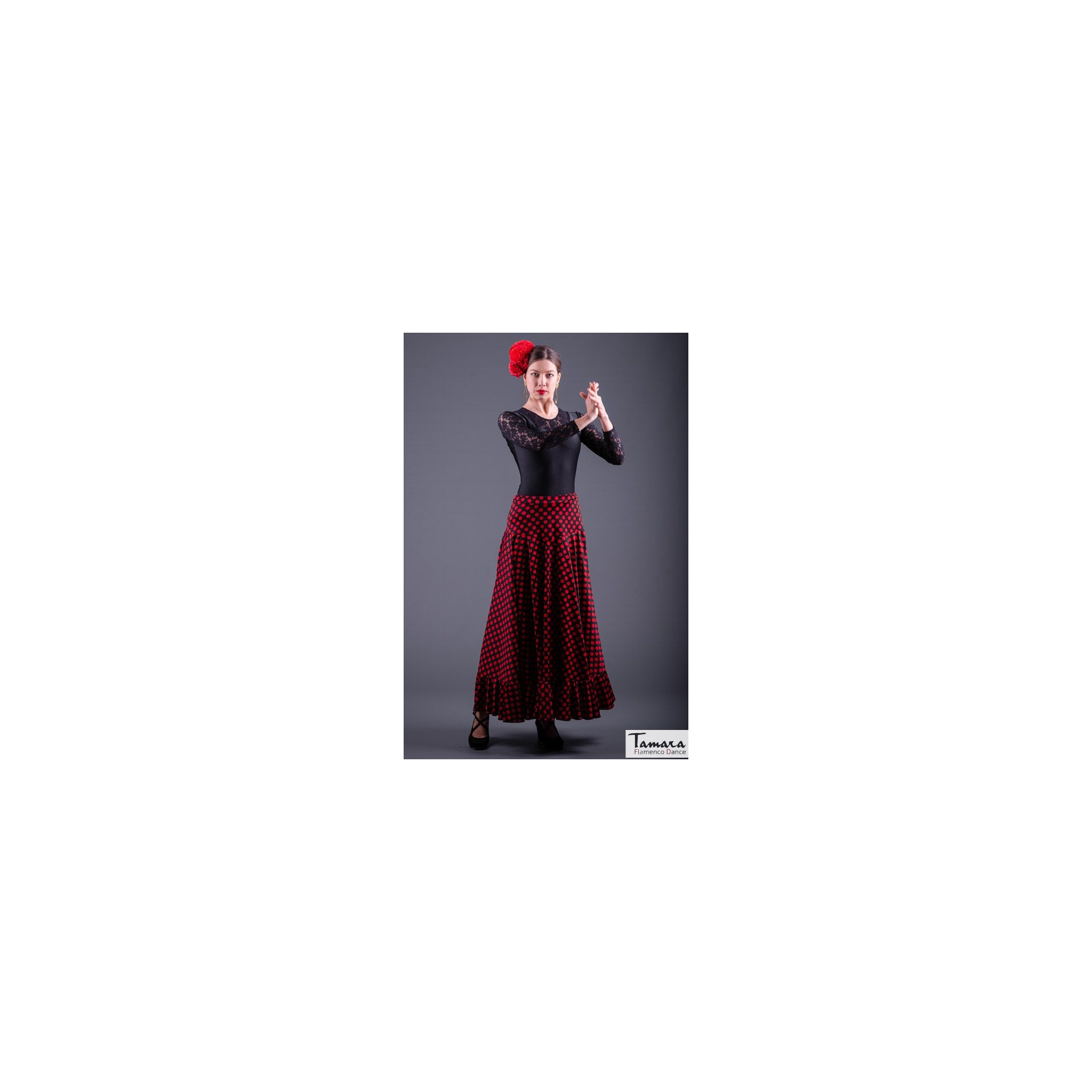 Description du modèle: La jupe Sevillana à pois est une jupe flamenca avec une coupe classique avec une centure élastique très adaptable. Ce modèle à une coupe taille haute, la ?capa? entière et les volants à la fin de la jupe.